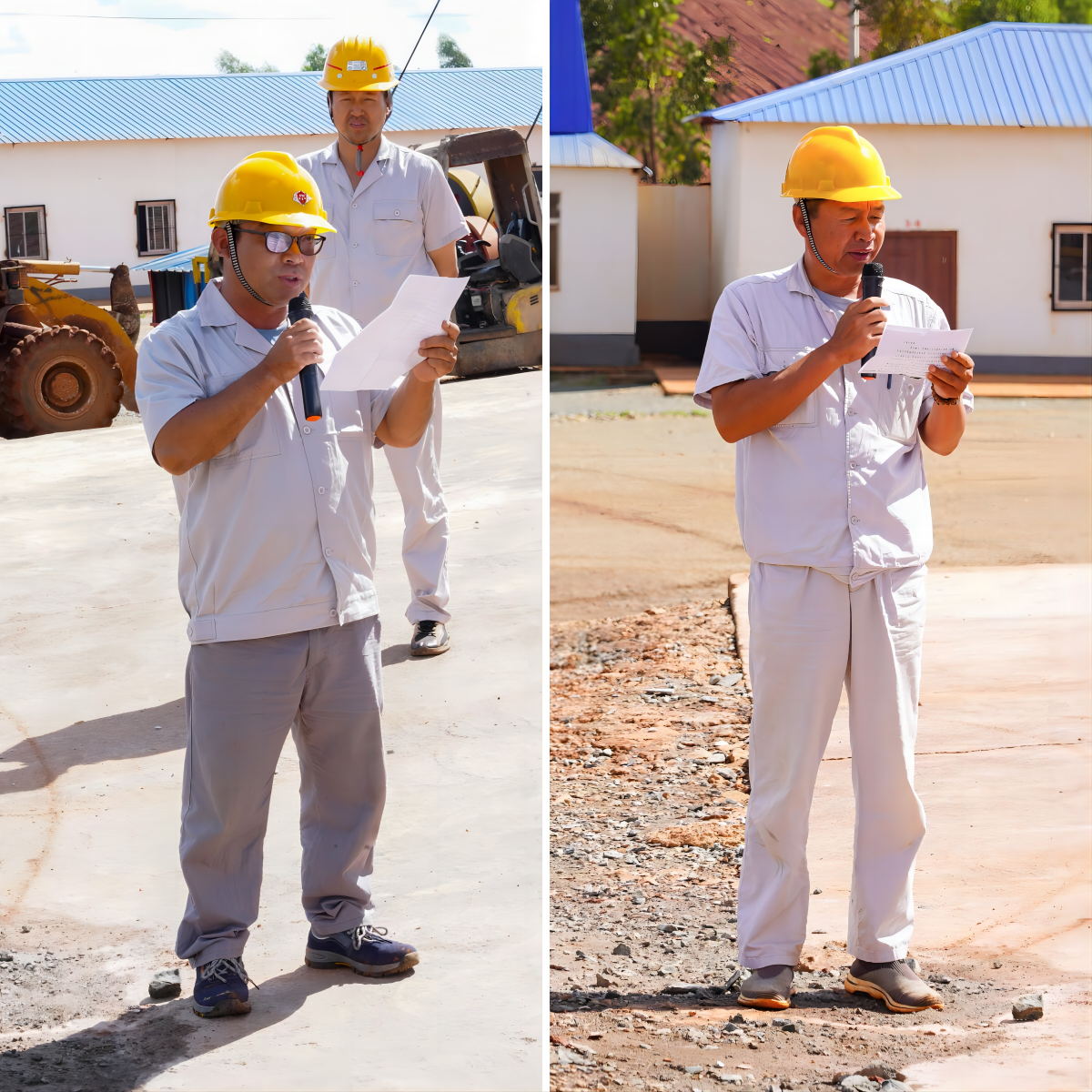 烏干達時間2024年4月15日,集團旗下瓦嘎蓋項目所在地天高云淡、鳥語花香。9點58分,在高大的主副井井架前,集團總經理譚久昌、項目部總經理劉輝、常務副總姜根水、技術總工宮永吉、井建總工方學興、總經理助理馬建軍、副礦長劉亞奇、王曉峰、安環(huán)部部長馬飛駿、安保部部長王小慶、李中和、技術部部長寧彥紅、選冶電氣總工張東江、運輸部部長李揚、基建部部長侯方、基建保障部部長何利軍及各工區(qū)區(qū)長、相關中方員工、屬地員工代表等32人整齊列隊、滿懷喜悅,伴隨著27響鳴槍聲,一場簡約而隆重的主副井井筒掘砌竣工儀式隨之展開。