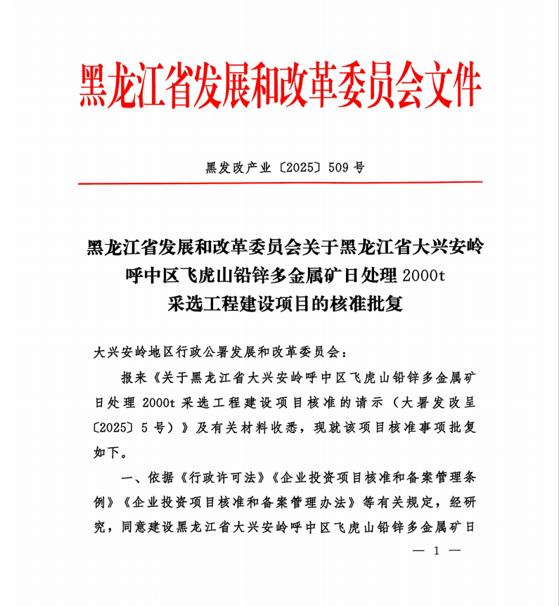 2025年6月9日,飛虎山鉛鋅多金屬礦項(xiàng)目獲得黑龍江省發(fā)改委的正式批復(fù),標(biāo)志著該項(xiàng)目投資開發(fā)取得重大進(jìn)步。