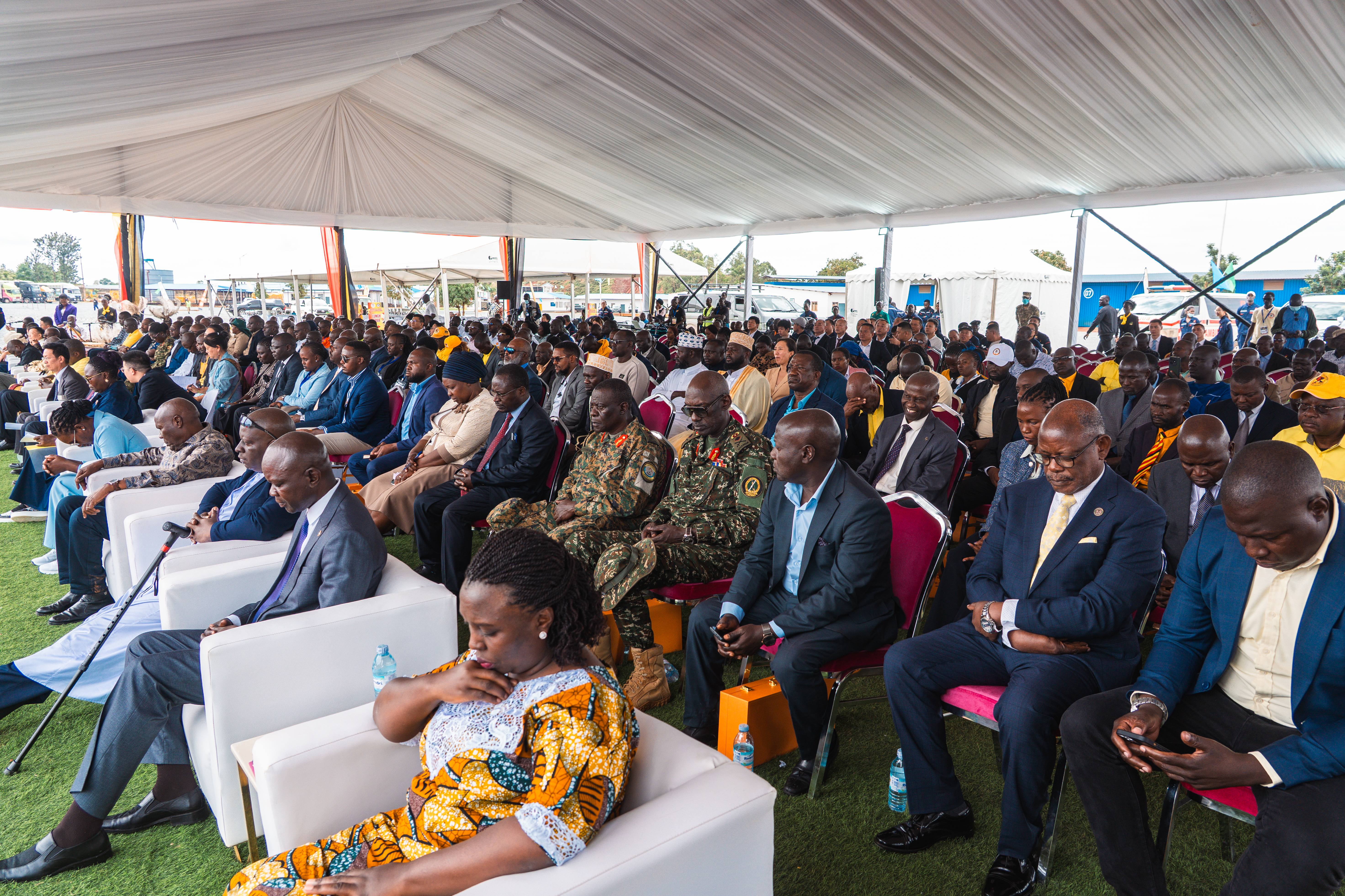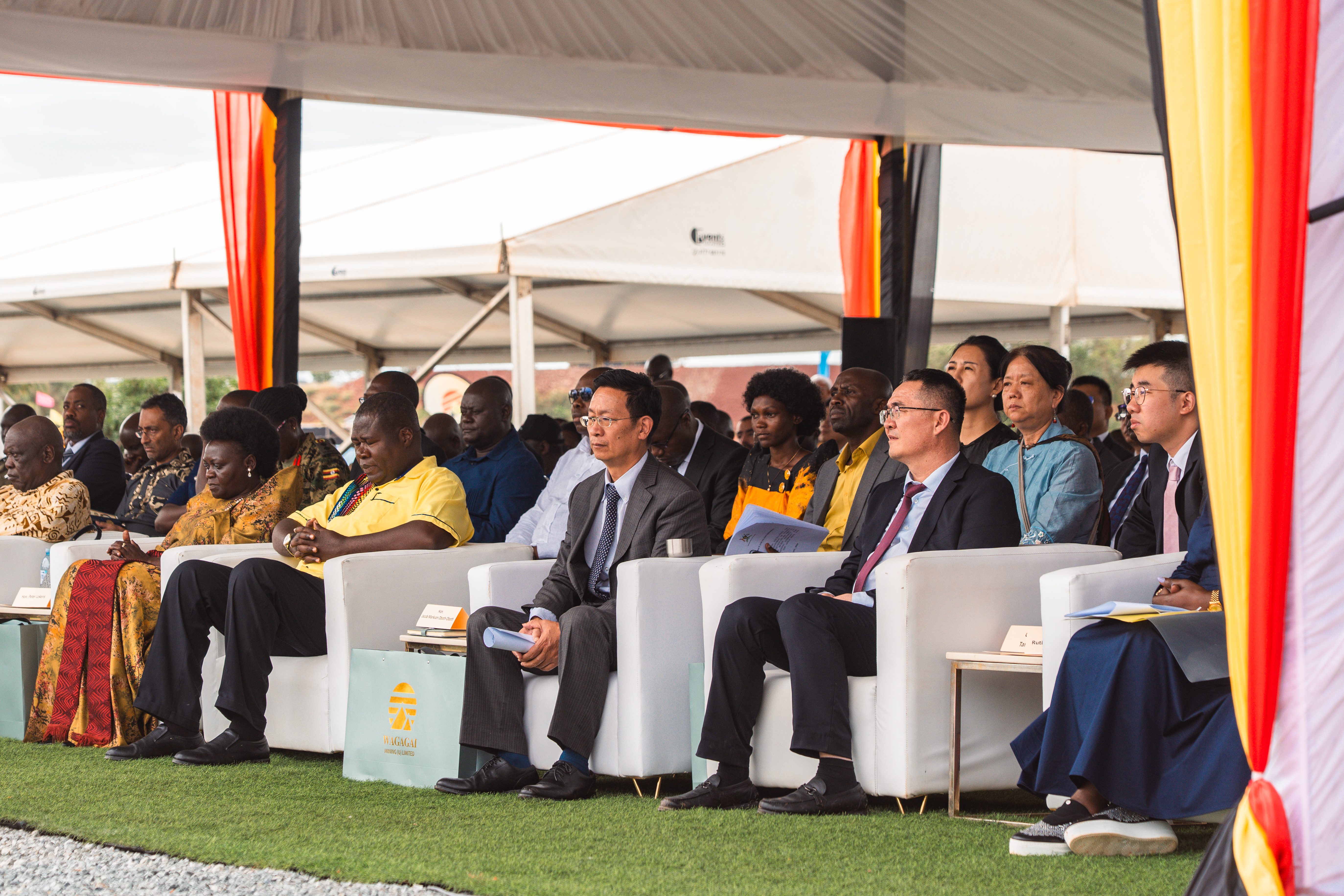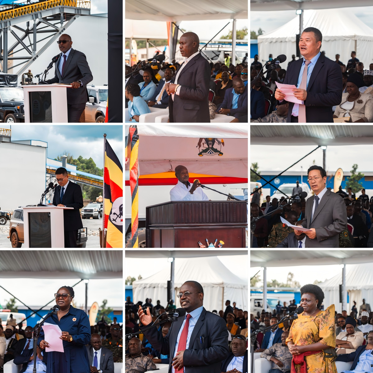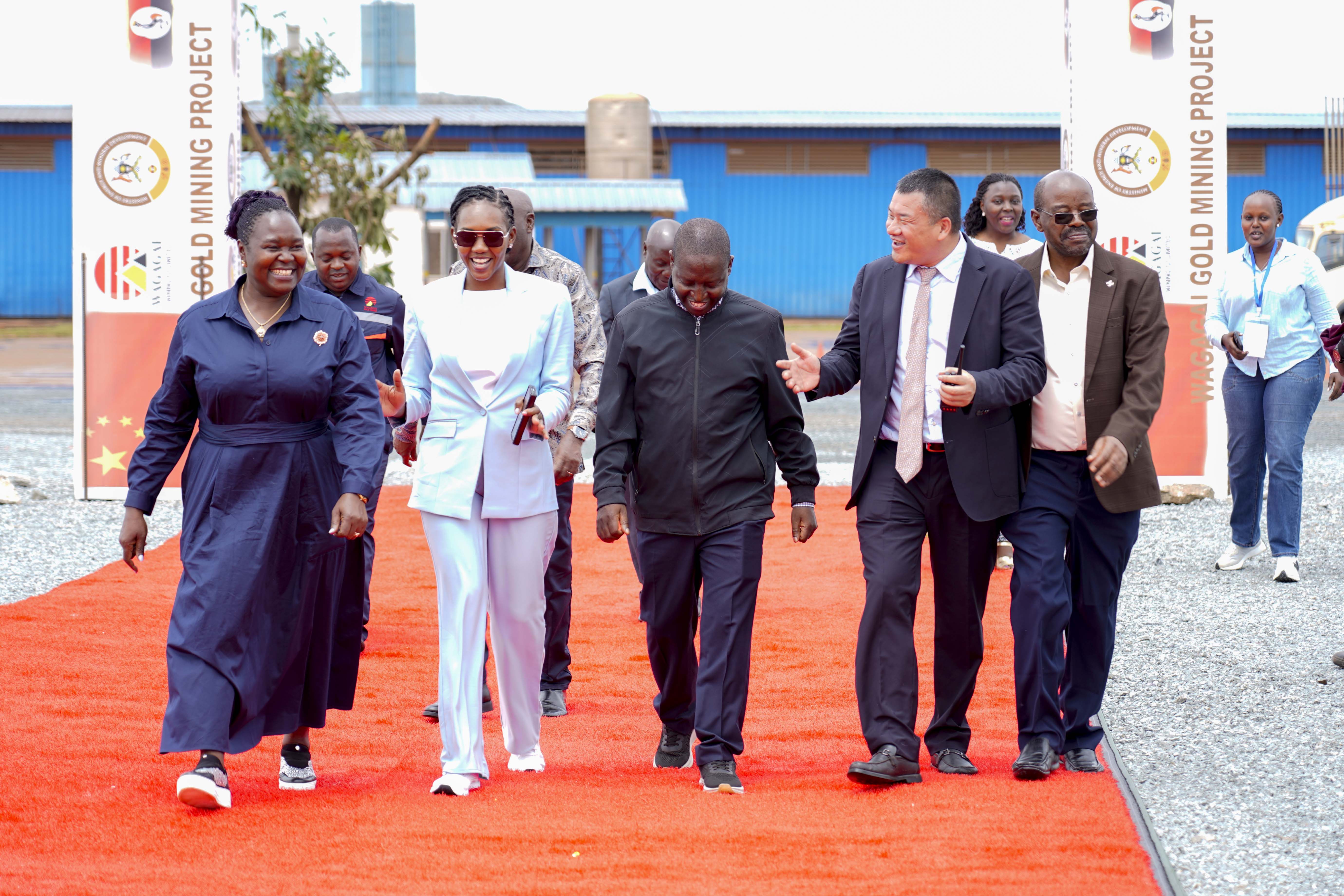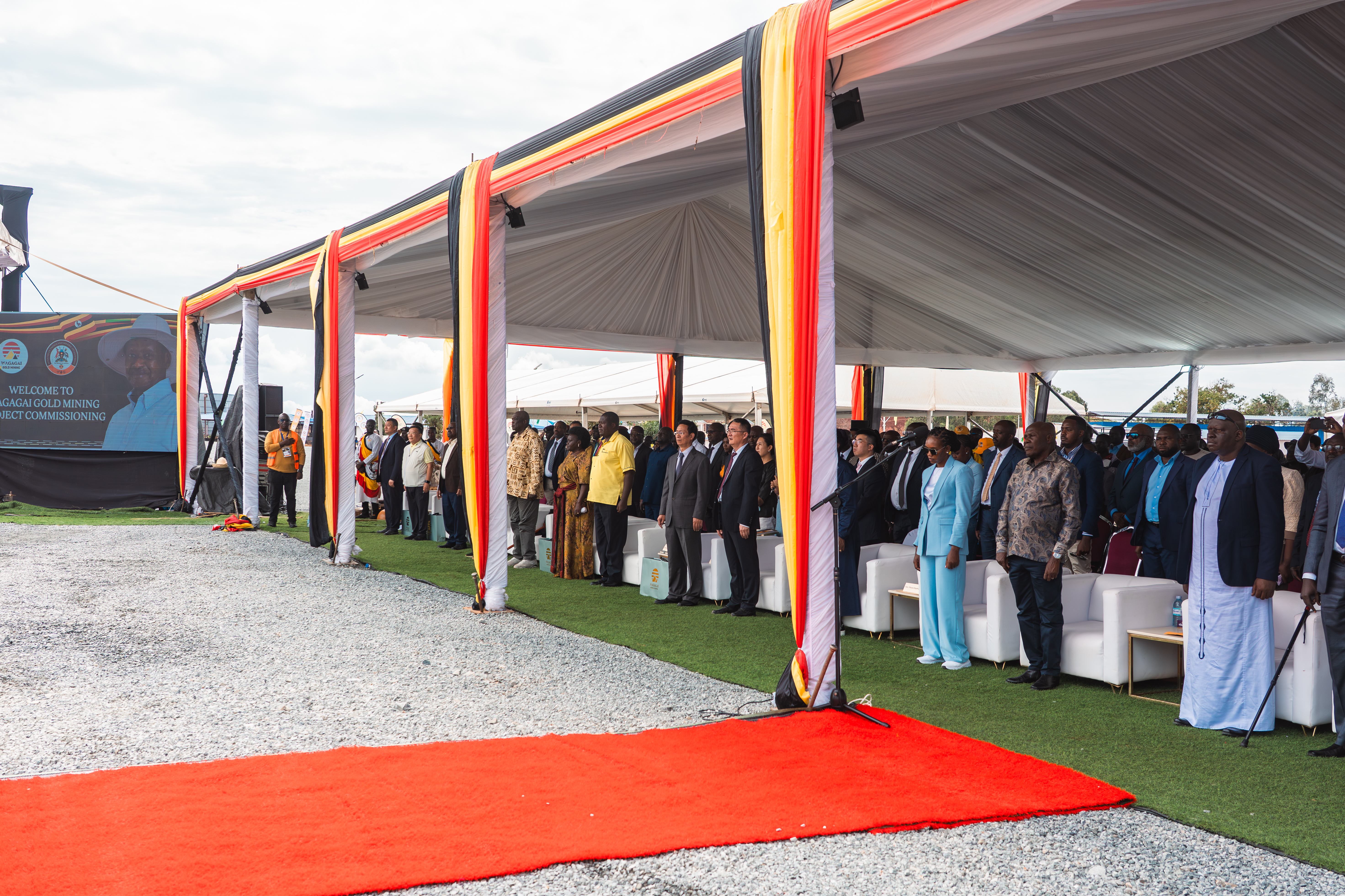 當(dāng)天,共有300余名重量級(jí)嘉賓出席儀式。烏干達(dá)能礦部部長(zhǎng)、礦業(yè)部長(zhǎng)、能源部長(zhǎng)、財(cái)政部長(zhǎng)、貿(mào)工部長(zhǎng)、國(guó)防部長(zhǎng)及常務(wù)秘書悉數(shù)到場(chǎng);地礦局局長(zhǎng)與副局長(zhǎng)率隊(duì)出席,多位國(guó)會(huì)議員、布西亞屬地國(guó)王及地方政府團(tuán)隊(duì)齊聚現(xiàn)場(chǎng);烏干達(dá)自由區(qū)管理局、中央銀行、國(guó)家礦業(yè)公司、黃金冶煉協(xié)會(huì)、礦業(yè)協(xié)會(huì)等代表均到場(chǎng)見證;中國(guó)駐烏干達(dá)大使館大使張立忠閣下與夫人親臨現(xiàn)場(chǎng);瓦嘎蓋公司的戰(zhàn)略合作伙伴、社區(qū)代表和周邊民眾共同分享了這一歷史時(shí)刻;廠區(qū)外自發(fā)聚集的當(dāng)?shù)厝罕娸d歌載舞,洋溢著歡慶與自豪。